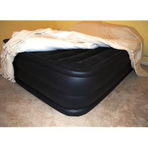 Designed for comfort and reliability, this Intex Raised Downy Queen Airbed offers the convenience of a portable airbed with the comfort of sleeping on a raised platform. Plush, waterproof flocking covers the mattress top, and an indentation on the side helps grip fitted sheets. The bed easily inflates and deflates with a high-powered built-in electric pump. It features a dual chamber construction, with the lower chamber functioning as a box spring to provide added firmness and support. It has a 20.8 gauge (.053mm) waterproof flocked top with 15 gauge (0.38mm) vinyl beams and 16 gauge (0.41mm) sides and bottom.